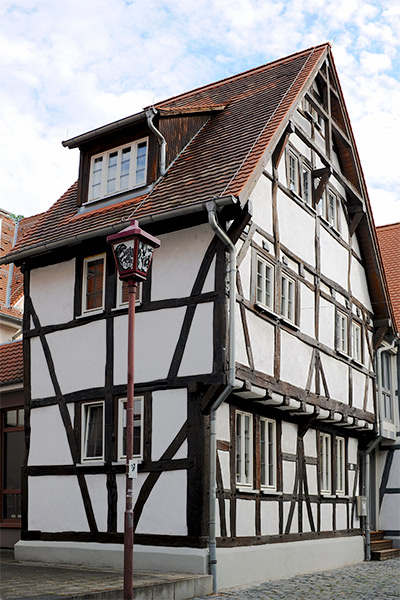 Das rechts abgebildete Haus wurde an einer anderen Stelle angebaut, restauriert und auf der Decke einer Tiefgarage wieder aufgebaut.